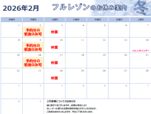 2月の店休日のお知らせです。 誠に勝手ながら、店側の都合により以下カレンダー通りの日程で営業いたします。 皆様のご予約・お越しをお待ちしております。